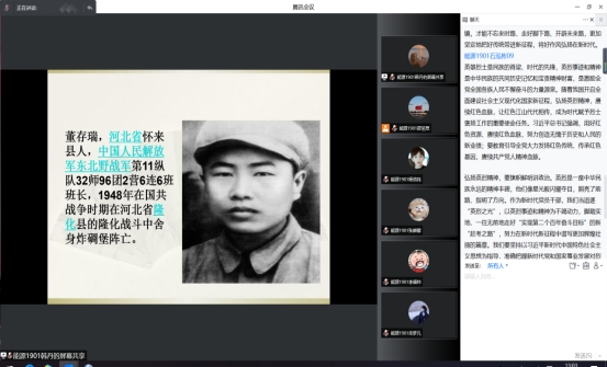能源1901沈艳杰说:“英烈者,军之剑,国之干,民族之魂。鲁迅先生有句名言:我们从古以来,就有埋头苦干的人,有拼命硬干的人,有为民请命的人,有舍身求法的人....这就是中国的脊梁。”