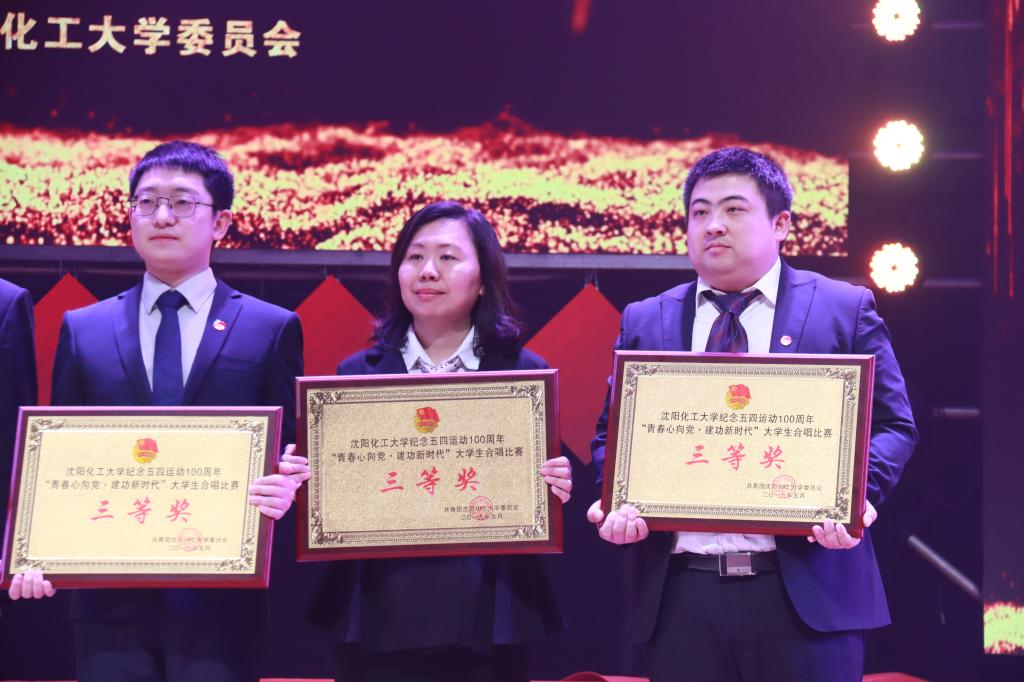 表彰大会结束之后,为积极调动广大学生的热情,展现我校学生日新月异的精神风貌,由共青团沈阳化工大学委员会主办开展的纪念五四运动100周年学生合唱比赛在大学生活动中心成功举行。此次活动的评委有沈阳音乐学院民族声乐系教师、全国声乐高级教师、辽宁省少儿声乐教师教研委员会理事黄琦老师;沈阳音乐学院声乐系教师、中国音乐家协会会员、中国合唱协会副理事、辽宁省合唱协会副理事李成龙老师;沈阳音乐学院声乐系教师、全国高级声乐教师、辽宁省音乐家协会会员杨帅老师;沈阳音乐学院声乐系教师、全国高级声乐教师、辽宁省音乐家协会会员、辽宁省合唱协会会员卢宏伟老师;沈阳音乐学院声乐系教师,辽宁合唱协会会员史美诗老师。