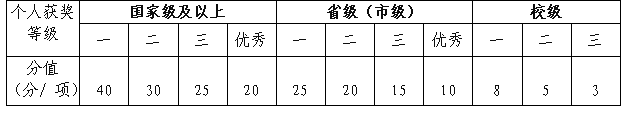 ③集体获奖项目的分值为个人项目的 2 倍,分值分配由各学院按照专业实际情况和学校相关文件自行制定。